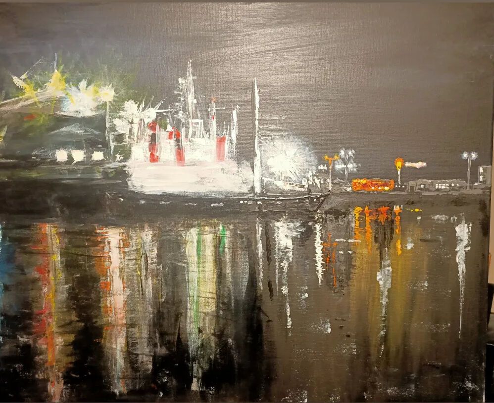 This painting of the trawlers at the port is a one off original artwork and collaboration between myself Mal Sanders and another local Ballarat Artist Jason Johnston, it shows the beauty of the night lights at the Portland port in Victoria Australia and it captures the Nightlife of a prawn trawler operator working late into the night, it captures the light, colour and beauty of the water and calmness of light in a busy atmosphere of the night in all its colour and spectacular light. it is painted in acrylic and the artwork was completed buy both artists with one brush and pallet knife. The right side was completed buy Jason Johnston and the left side was completed buy myself Mal Sanders. This painting was completed in one sitting on 60cm X 50cm on canvas