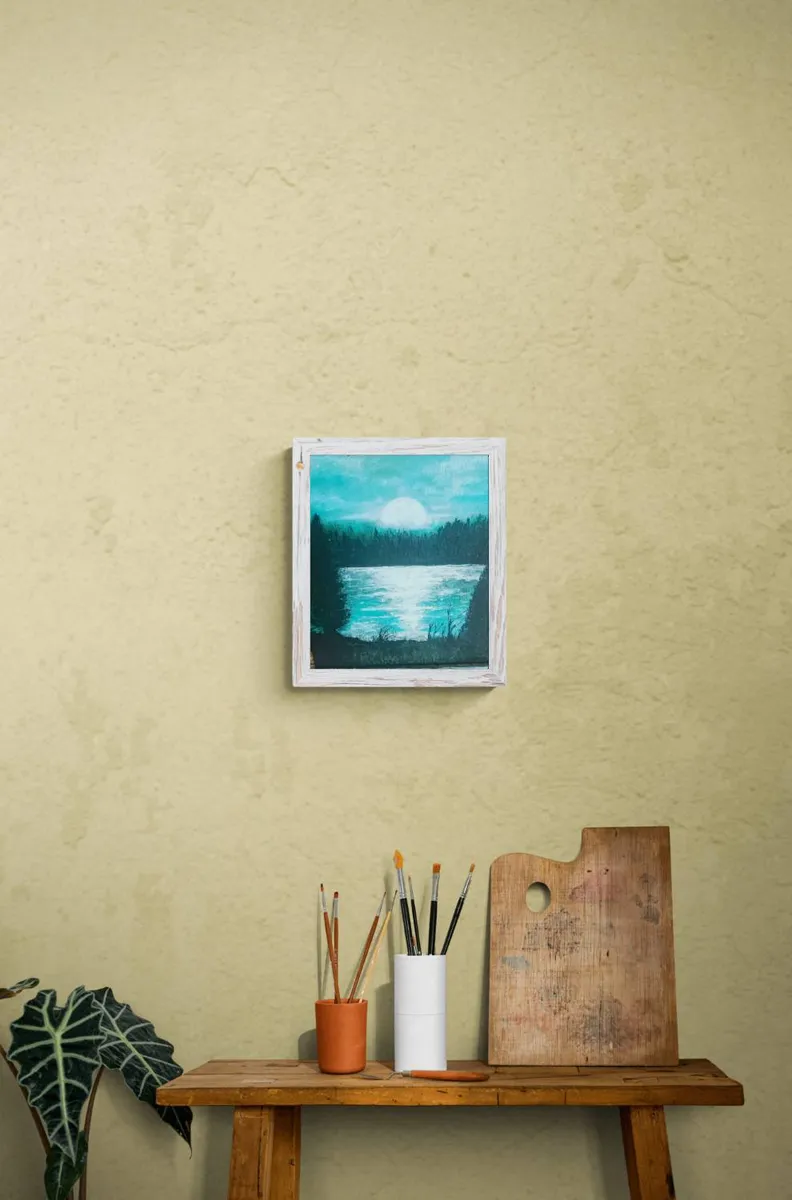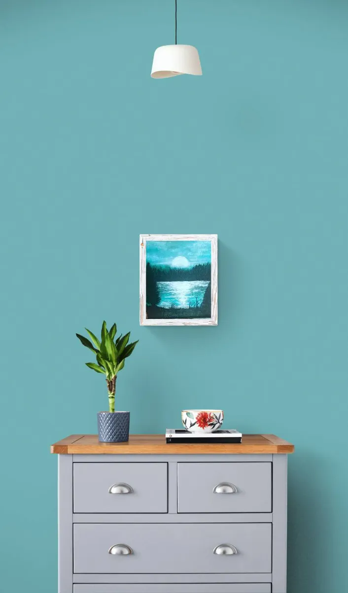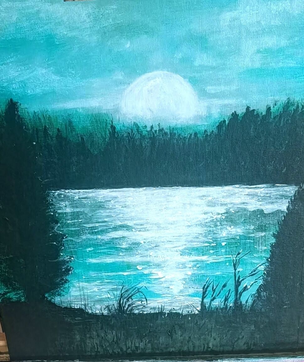 Turquoise moon is a beautiful painting that captures the spirit and essence of light and the beauty of the moon and the night light as it dances across the water and landscape and brings this painting to life. The colour scheme is of one of only 3 colours yet it still has plenty of interest to this composition it is painted on a canvas board 30cm X 36cm in acrylic paint and is ready to frame