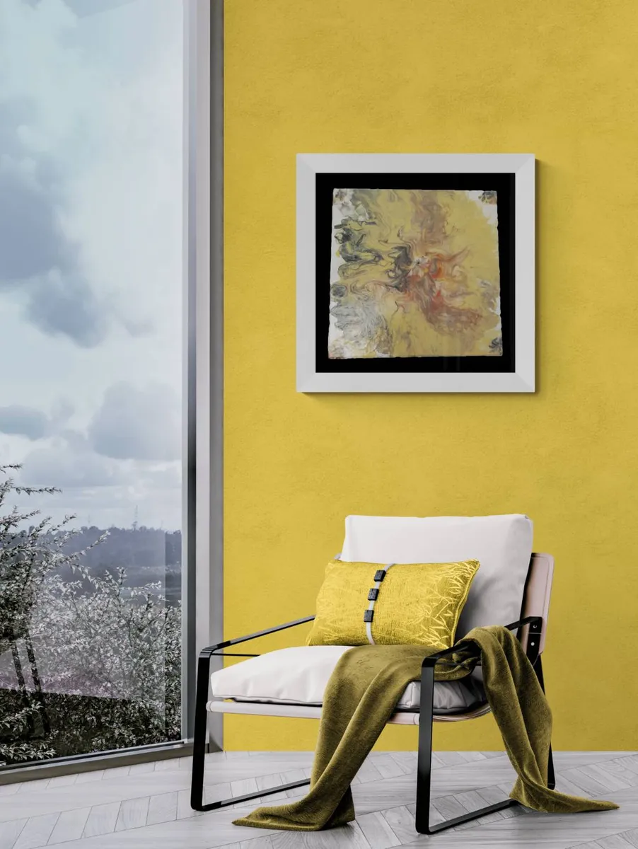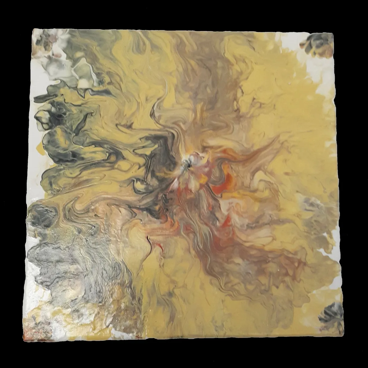 Handcrafted one-of-a kind 12" by 12" canvas. Base colors used are white and sand-yellow. Colors used and blown over the canvas are: metallic copper, metallic gold, champagne gold, burnt umber and black cell activator. Three coats of gloss varnish applied after paint dried to protect the colors. Signed and dated on back.