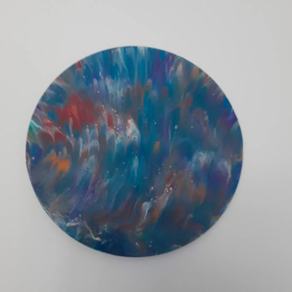 10" round acrylic fluid pour on high density fiberboard (HDF). Each piece is unique and unrepeatable. Two coats of clear gloss protective applied to protect the surface. It's difficult to show the true depth and texture of the actual work in a photograph. Signed & dated on back.